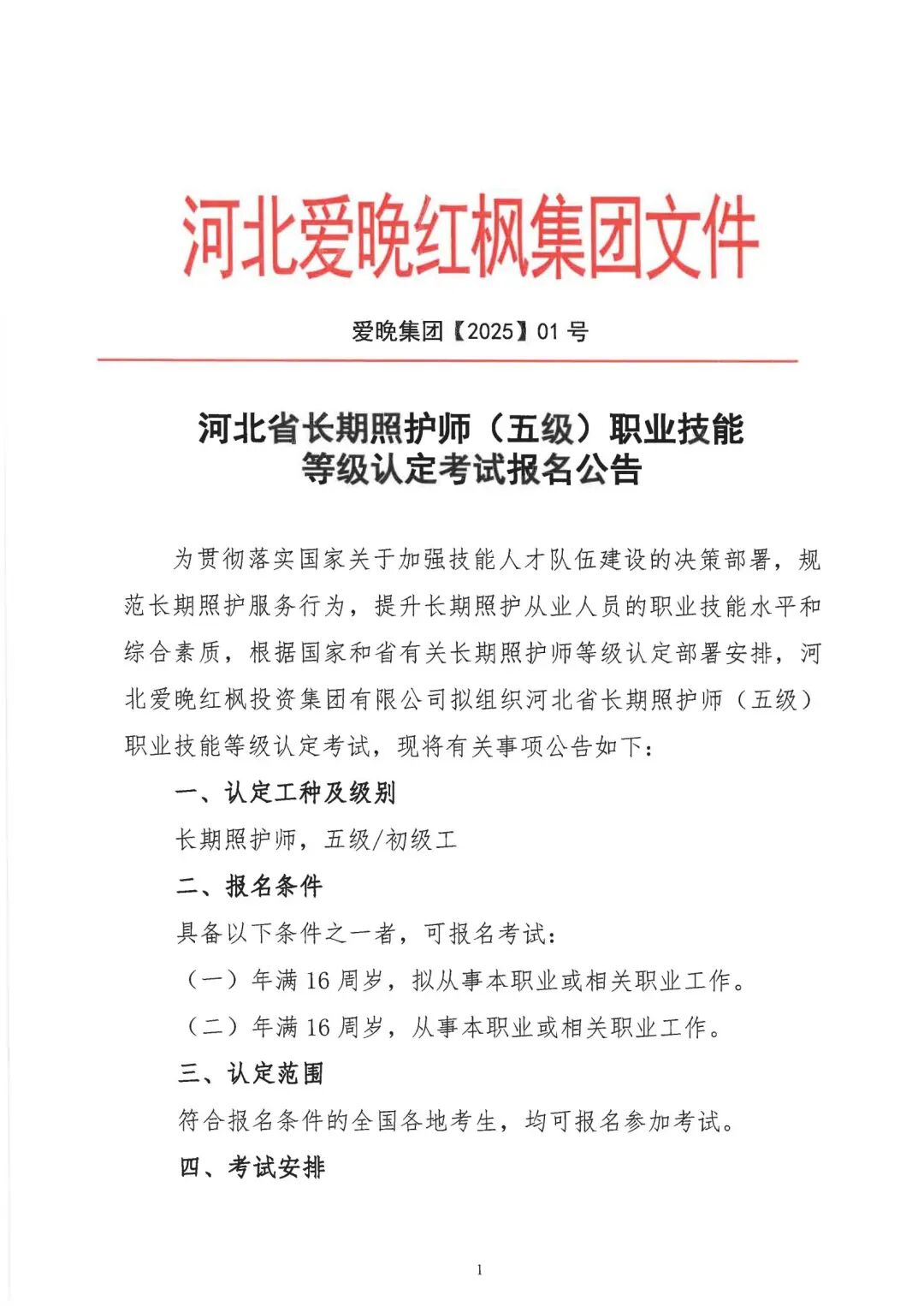 为贯彻落实国家关于加强技能人才队伍建设的决策部署,规范长期照护服务行为,提升长期照护从业人员的职业技能水平和综合素质,根据国家和省有关长期照护师等级认定部署安排,河北爱晚红枫投资集团有限公司拟组织河北省长期照护师(五级)职业技能等级认定考试